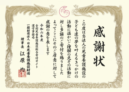 - 日本児童養護施設財団から「感謝状」を贈呈