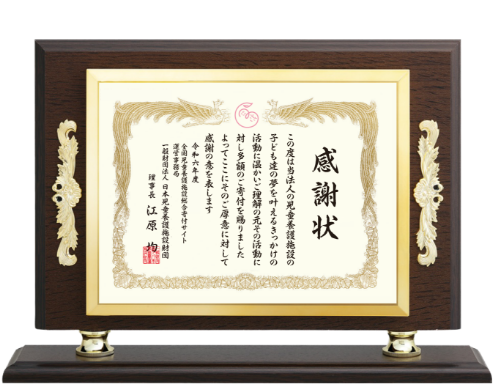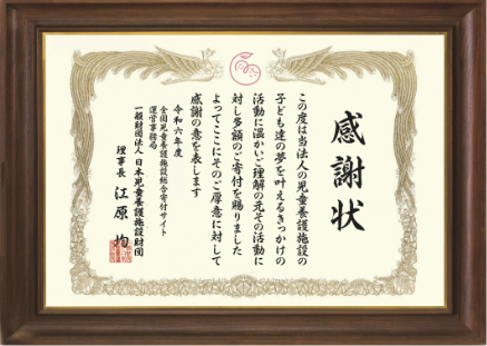- 日本児童養護施設財団から「額縁付き感謝状」を贈呈