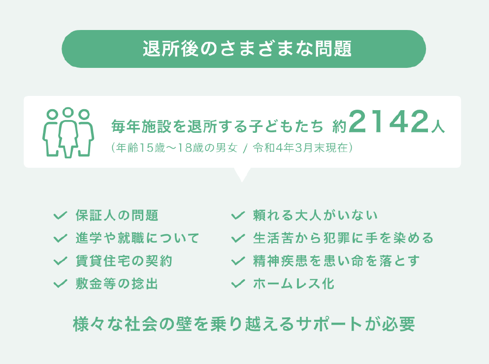 施設を巣立った後の子どもたちは、多くの若者が18歳前後で生活費を自力で賄う必要に迫られます。家賃や生活費、進学・就職、頼れる大人が身近にいないことなど、さまざまな社会の壁に直面する可能性があります。