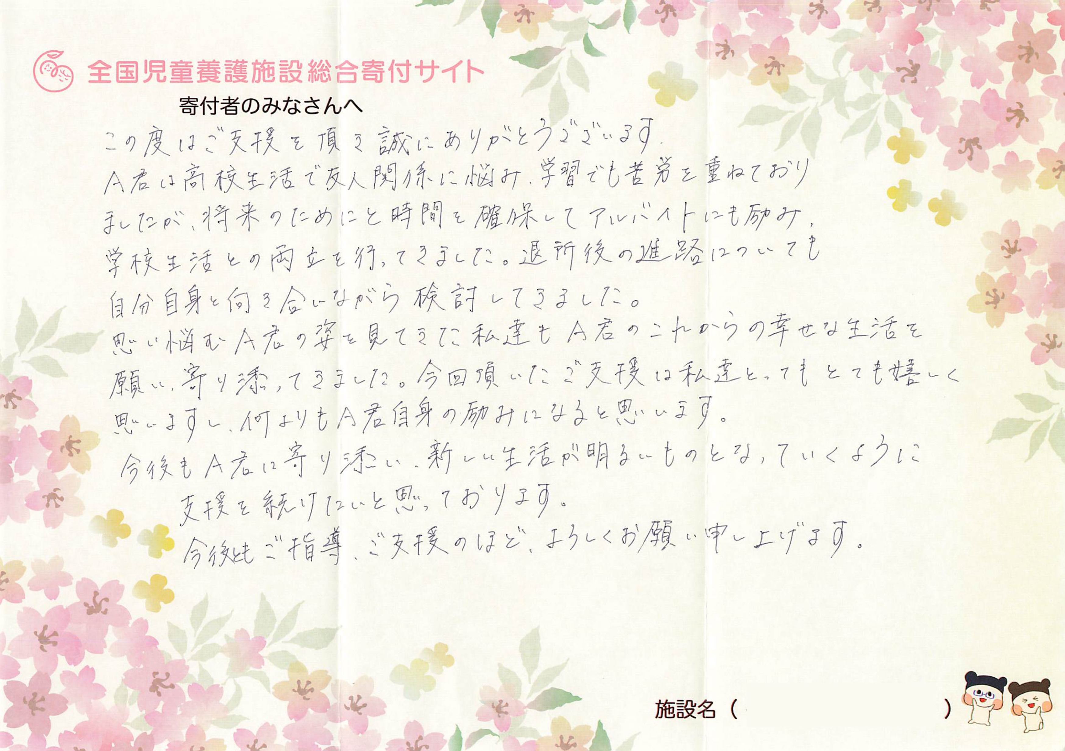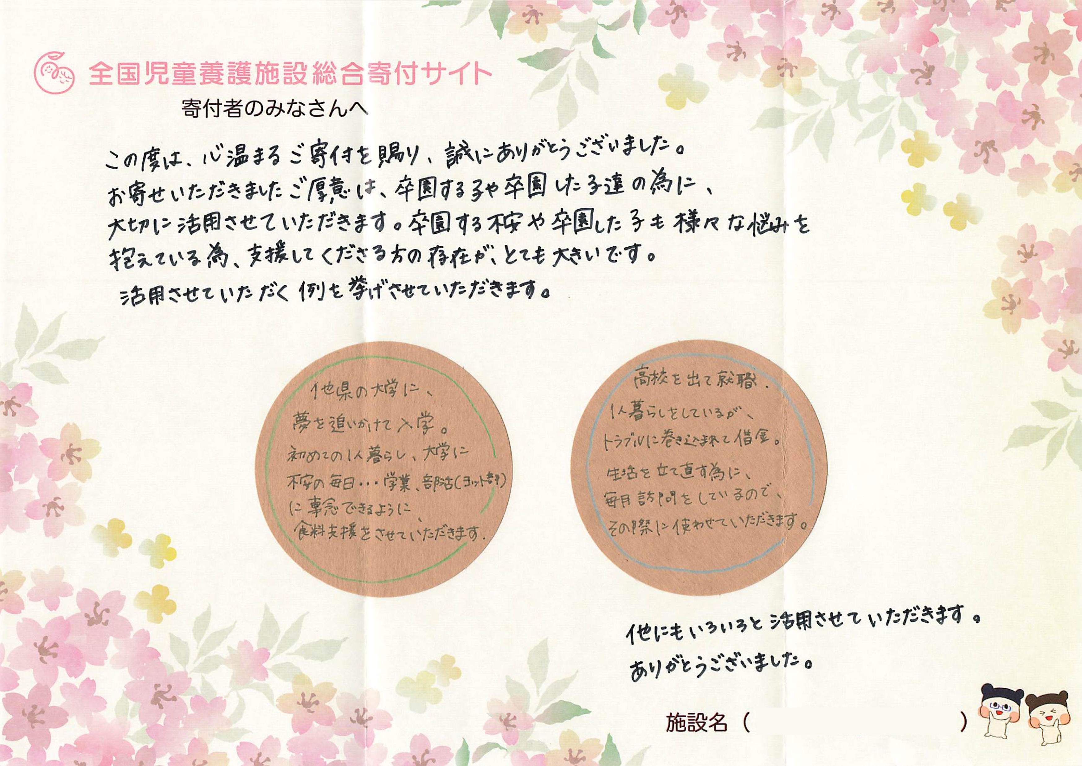 今年もご寄付を届けさせていただいた児童養護施設を卒園する子どもたちや施設の職員の方々から、寄付者の皆様へお礼のメッセージが財団にたくさん届いております。今年も全国児童養護施設総合寄付サイトのブログ内で、随時、紹介をしてまいりますので、ぜひ、ご覧ください。